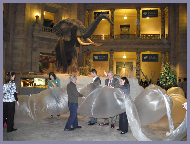New York-based Huang is known for his unique installations that merge everyday items and electronic components with air and water to create interactive organic-like environments and sculptures. Through a Smithsonian Artist Research Fellowship, Huang spent two months in 2007 at the NMNH where he was able to interact with scientists and study the museum’s collection of bioluminescent sea creatures. The insights gained through this research resulted in a collection of interactive and colorful bioluminescent-like mechanical deep ocean dwellers. Huang continues to refine the details and mechanics of his collection and the current exhibition is truly a marvel of knowledge and imagination—an integration of art and science. The evening ended with Huang and audience volunteers creating a floating organic-like sculpture in the museum’s rotunda made even more impressive with the Great African Bush Elephant standing above and majestically in the center.
